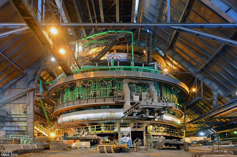 Wnętrze hali lejniczej wielkiego pieca podczas remontu przeprowadzonego w 2016 roku. Widoczna gruba okrężnica oraz zielone instalacje chłodzące trzon pieca. Fotografia ze strony: flickr.com